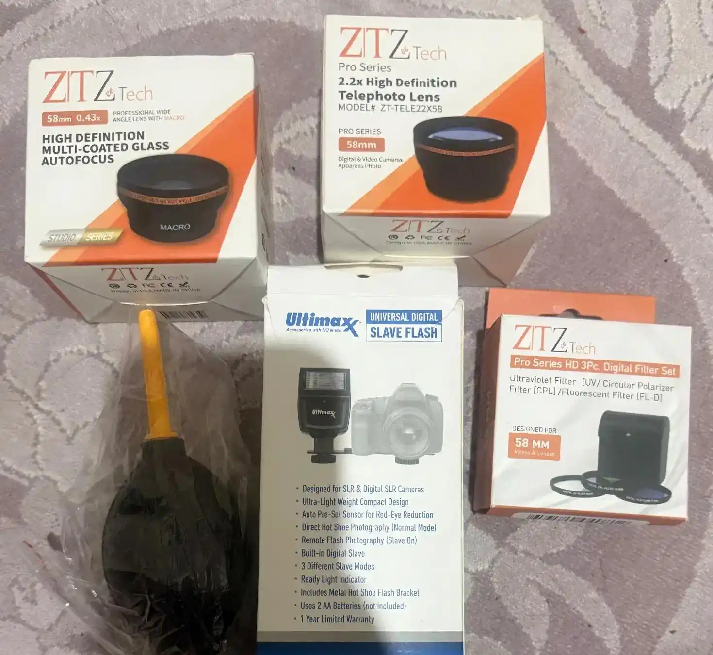 بدنه دوربین DSLR کانن EOS 2000D / Rebel T7، باتری لیتیوم-یونی کانن LP-E10، شارژر باتری LC-E10، درپوش لنز، درپوش بدنه، بند گردنی، کارت حافظه SanDisk 64GB، کوله پشتی برای دوربین و لنز، سه پایه فول سایز، کیت فیلتر 58 میلیمتری 3 تکه، لنز تله فوتو کمکی 58 میلیمتری 2.2x، لنز واید کمکی 58 میلیمتری 0.43x، هود لنز 58 میلیمتری Tulip، کارت خوان حافظه پرسرعت، چراغ قوه کمکی فوق العاده روشن، قلم تمیزکننده 2-1، دمنده گرد و غبار، کیت شروع Deluxe، پارچه تمیزکننده میکروفایبر ZeeTech، لنز کانن EF-S 18-**mm f/*-*** و کانن EF **-*00mm لنز f/4-5.6 III