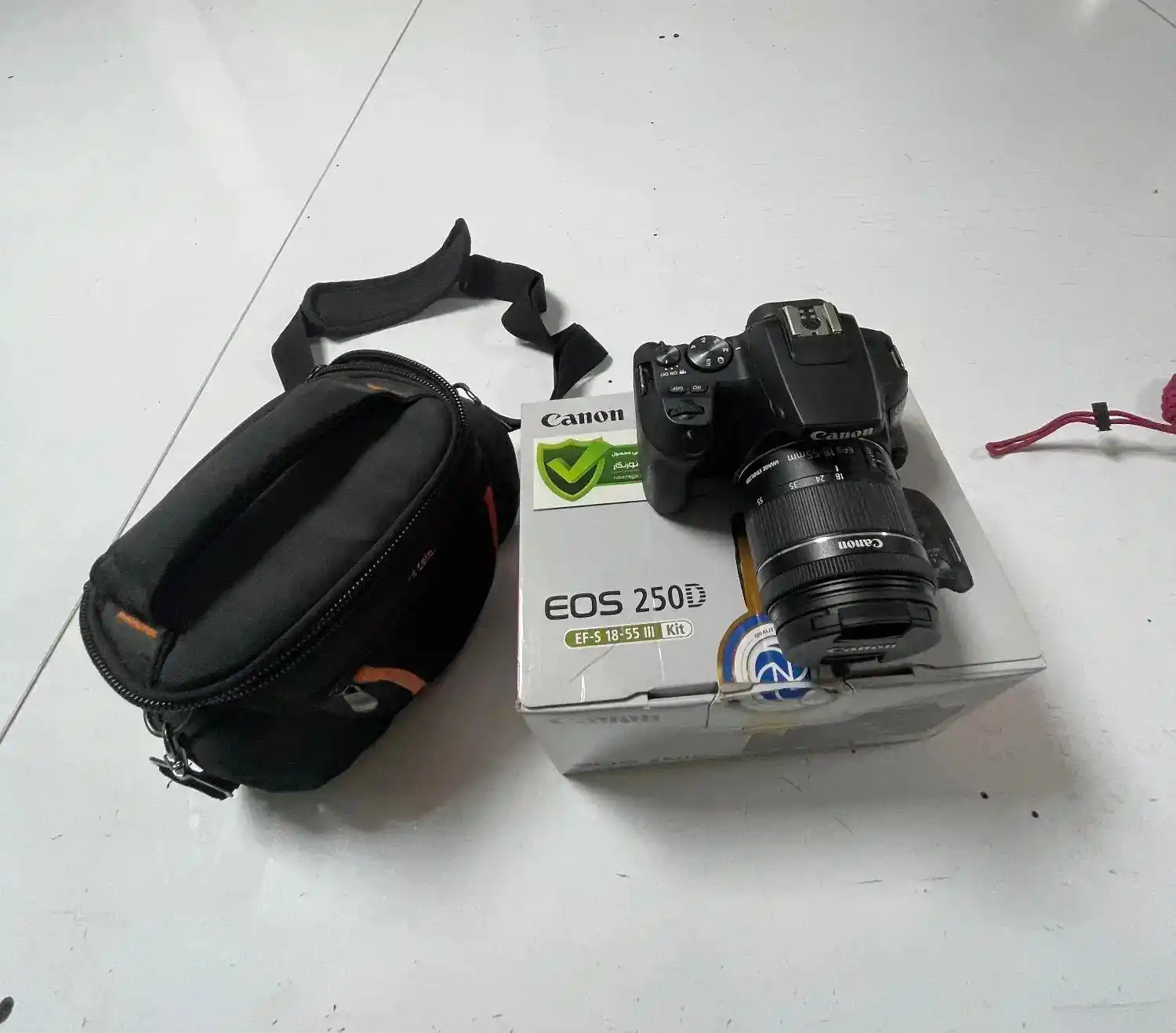 یک عدد دوربین کانن مدل 250D کاملا نو در حد ۲۰۰ شات گرفته شده به همراه وسایل جانبی شامل: سه پایه کیف مخصوص