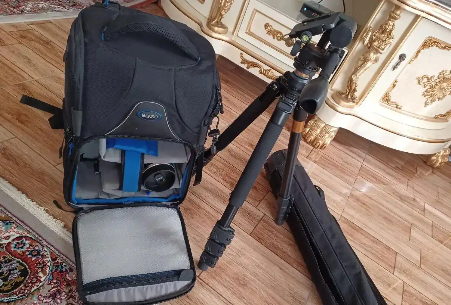 دوربین بدون هیچ ایراد و مشکل می باشد، چون پول لازمم میفروشم -همراه دوربین ۲ عدد کیف که یکیش کوله پشتی حرفه ای مدل Benro 400 هست و یکیشم کیف کوچک، یک سه پایه حرفه ای هم دارد،