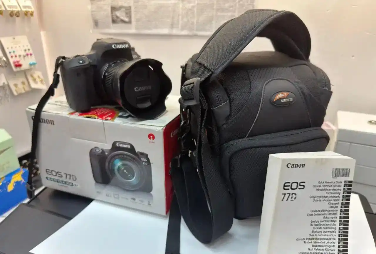 دوربین کنون مدل 77D لنز ۵۵-۱۸ تعداد شات ۸۸۰۰ عدد خانگی و بسیار تمیز با وسواس زیادی ازش نگهداری شده (مثل آکبند هست) همراه با کیف بسیار محکم و ضد آب، محافظ لنز، محافظ صفحه نمایش ، هود لنز با کارتن و تمام لوازم کامل همراه بسته بندی. قیمت مناسب