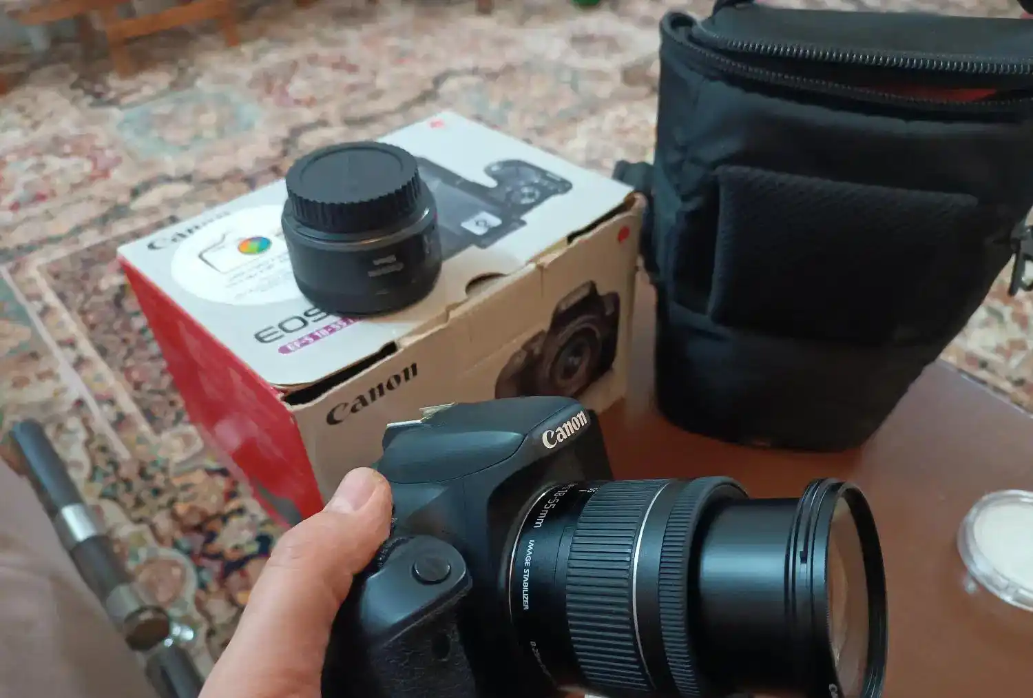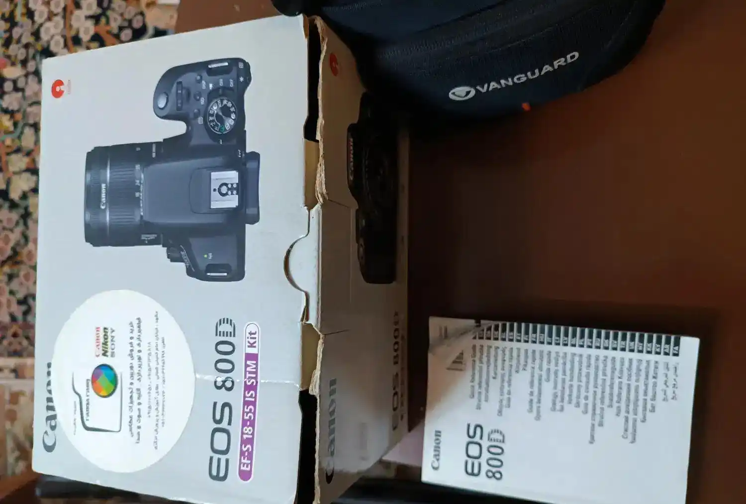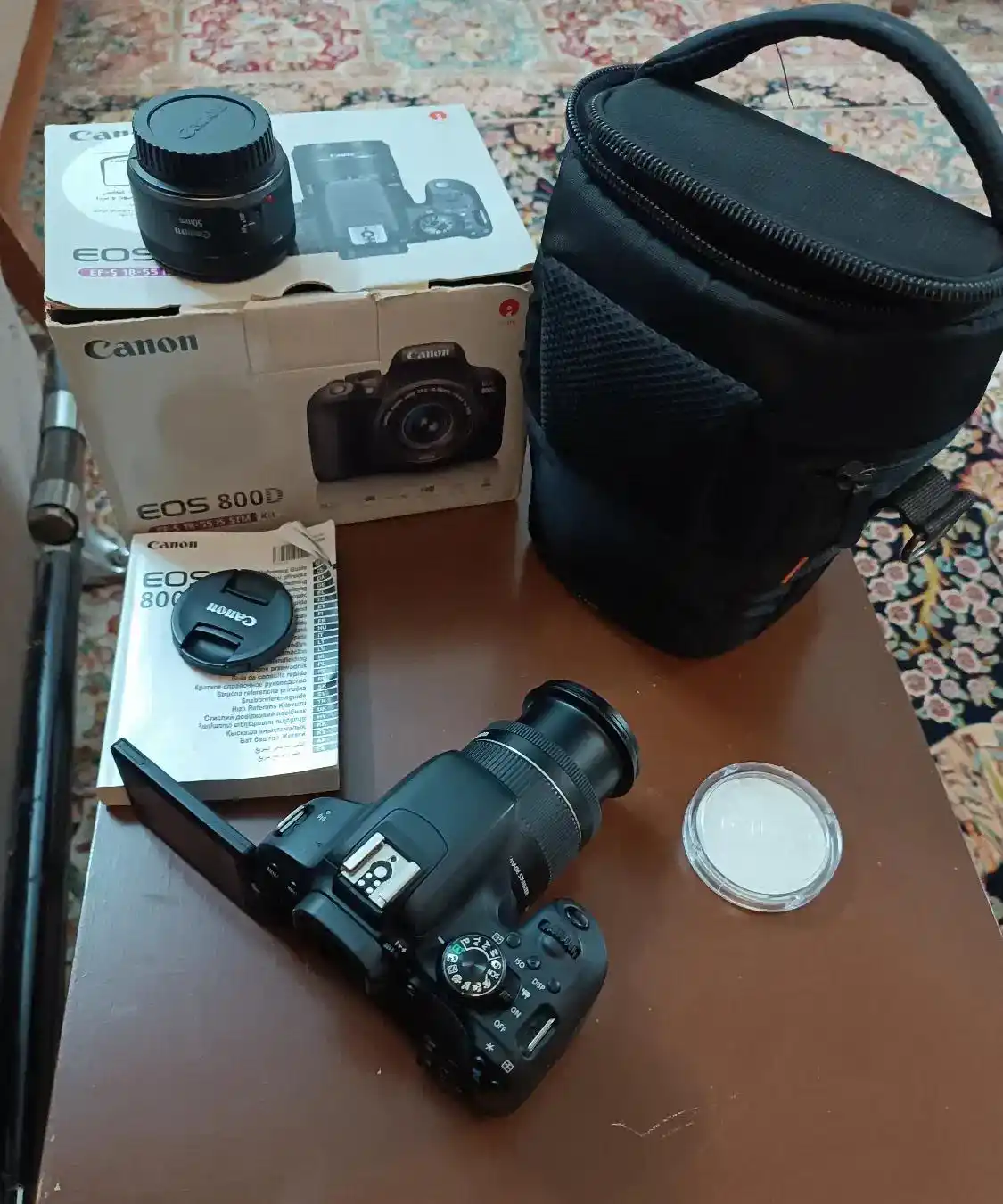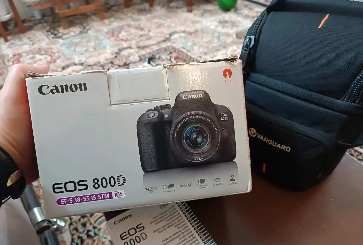 دوربین عکاسی canon eos800d همراه با لنز اضافه ef 50mmf1.8stm در حد نو و یک عدد باطری یدک اصل canon و یک کیف با کیفیت همراه با کارتن و دفترچه راهنما و همه وسائل