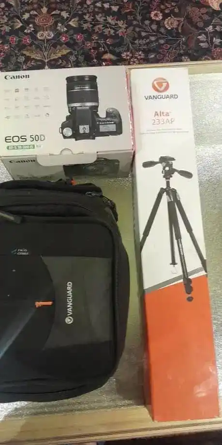 دوربین کانن اصل ژاپن مدل Eos 50D ( زیر ۳۰۰۰ شات در حد نو ) لنز اصل ژاپن حرفه ای مدل 18_200 کیف مخصوص دوربین و لب تاپ ضد ضربه و ضد آب مارک ونگارد سوئیس پایه دوربین حرفه ای ؛ چرخش ۳۶۰ درجه ؛ با تراز مارک ونگارد سوئیس