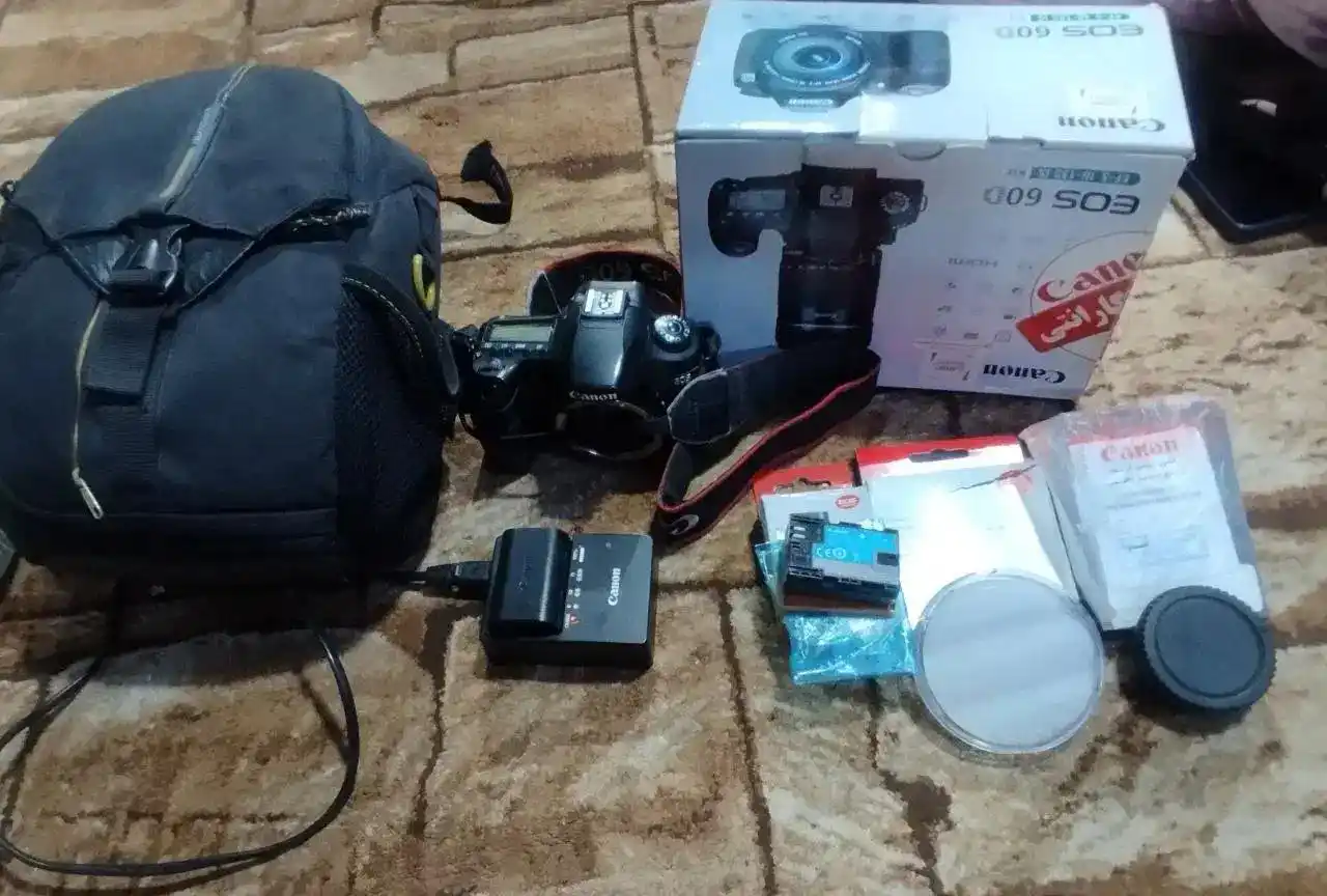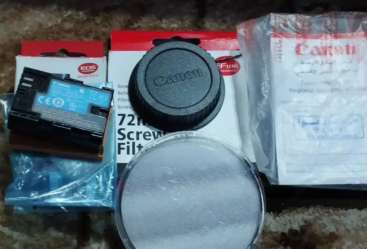 فیلتر روی لنز و محافظ صفحه مانیتور با سه پایه بلند و کیف سه پایه و کیف دوربین و کارتن اصلی خود دوربین