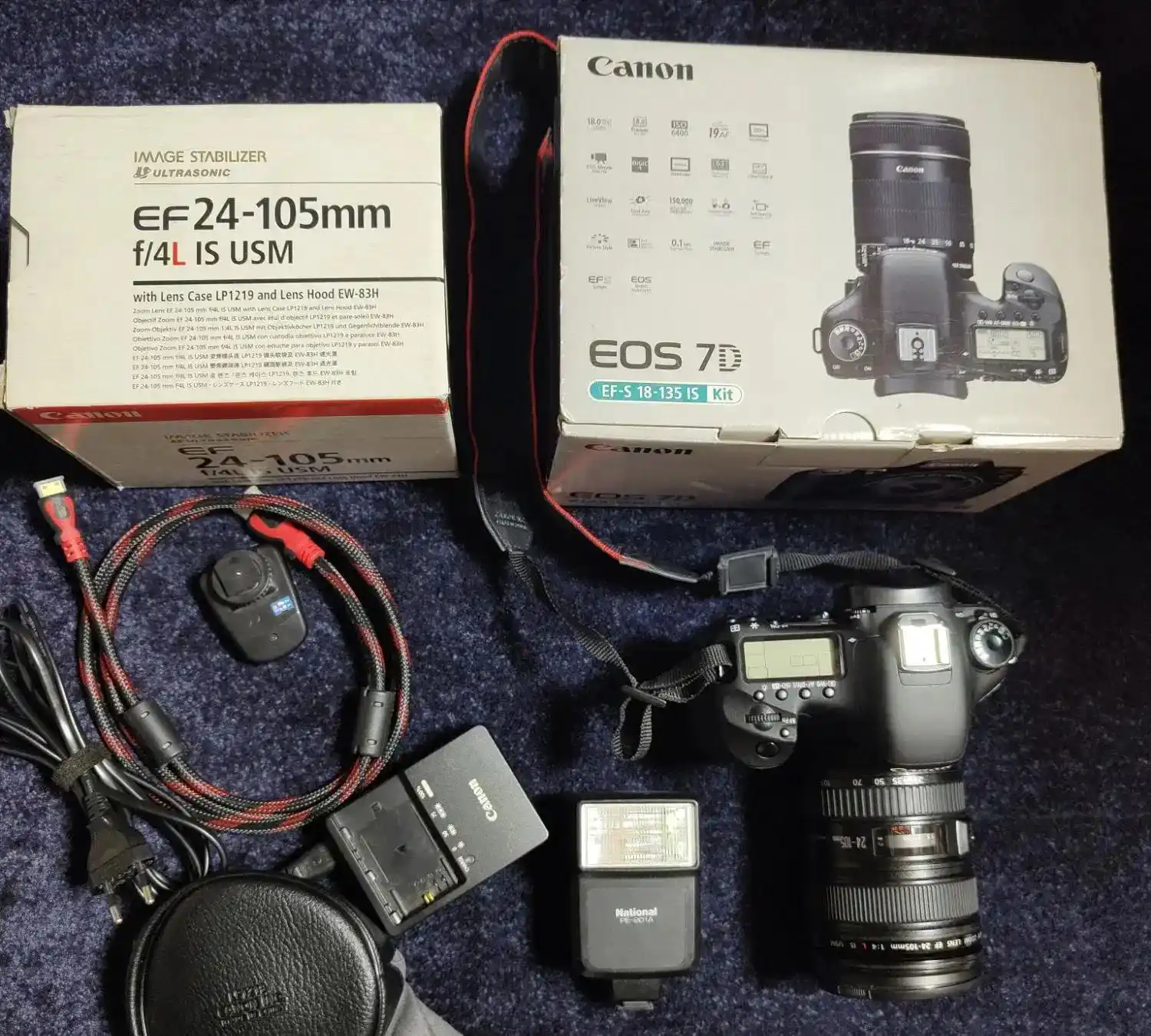 کنون 7D همراه با لنز EF 24-105 mm f/4L IS کوله محافظ lowepro فلاش و رم حافظه ، بسیار تمیز در حد نو تعداد شات 8695 همراه با کارتون .