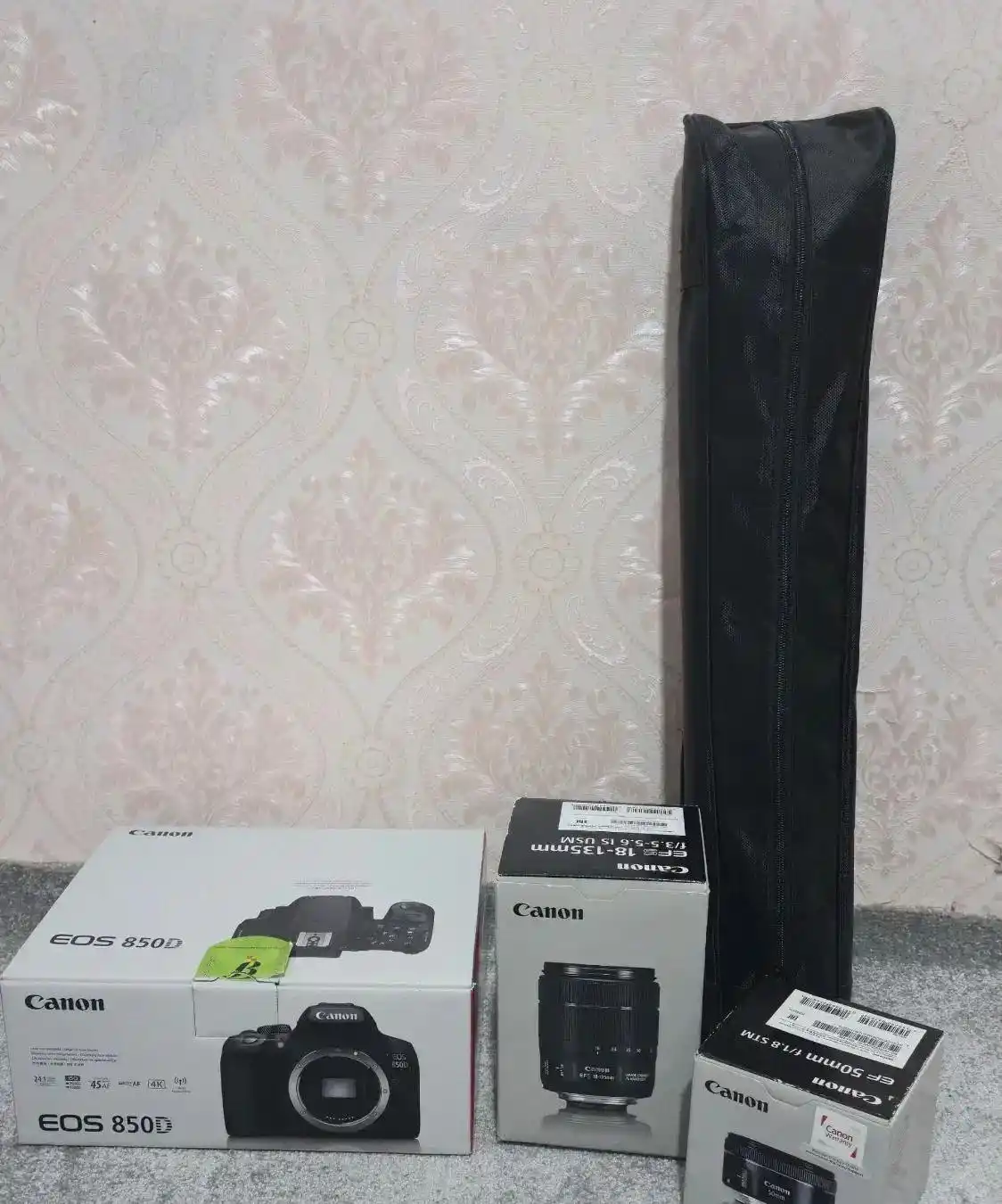 دوربین کانن 850D با یه لنز 18_135 و لنز فیکس 50 میل و سه پایه بیک