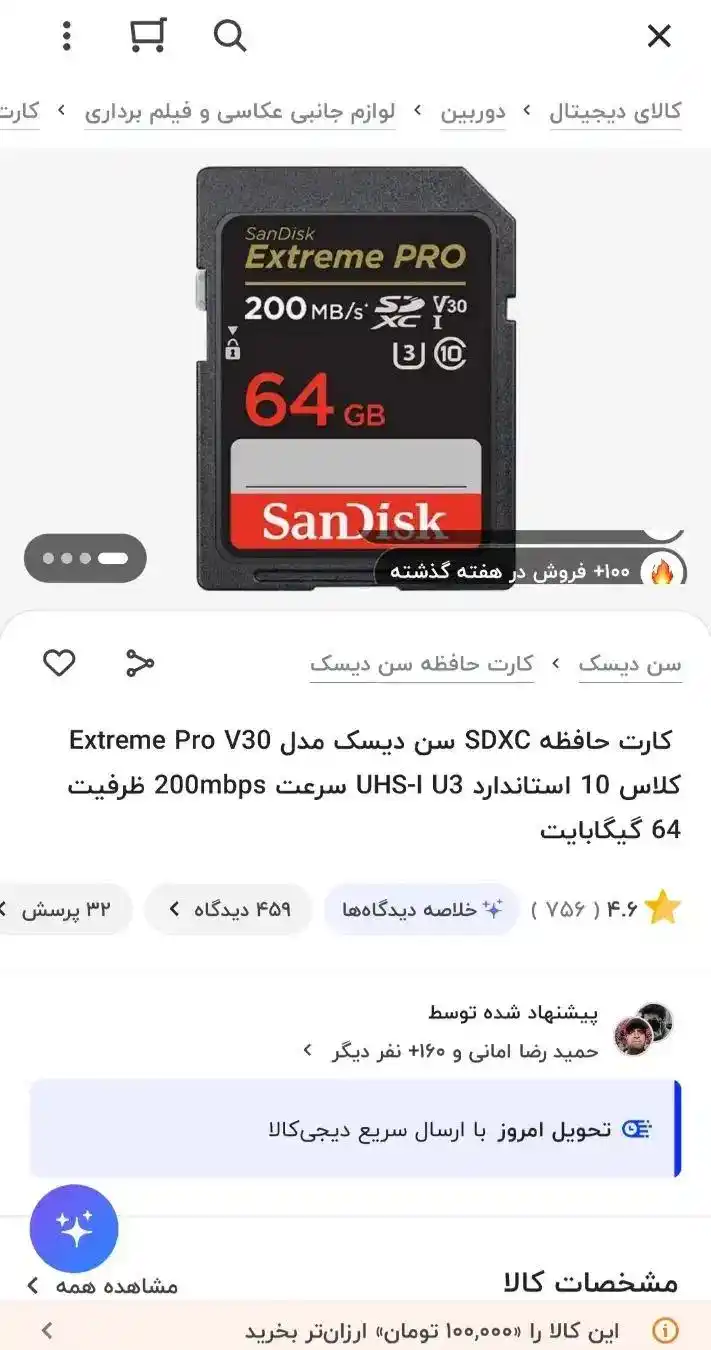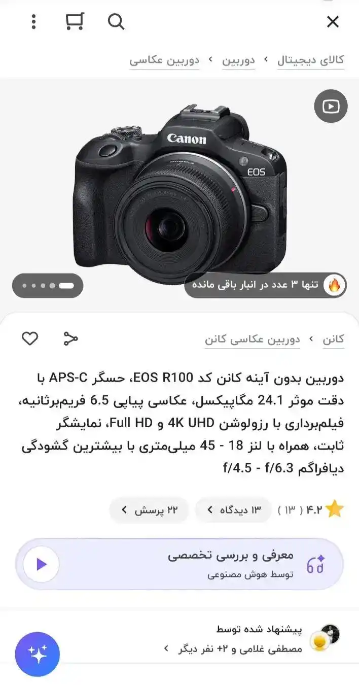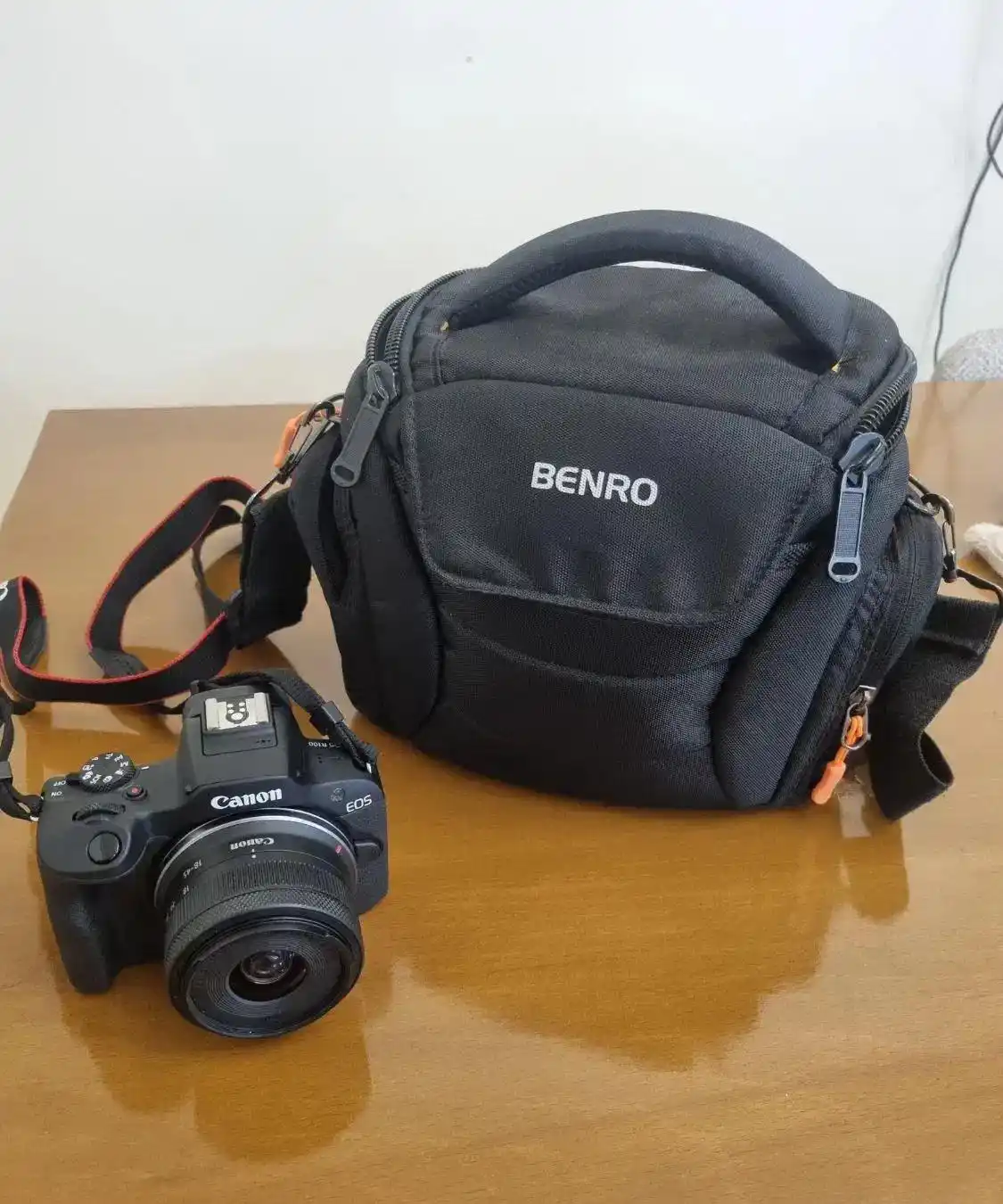 دوربین عکاسی بدون آینه canon R100 به همراه کارتن متعلقات و لنز ۱۸-۴۵ ، دوربین صرفا برای شروع کلاس عکاسی خریداری شده ولی چون ادامه ندادم میخوام بفروشم، کمتر از ۲۰۰ شات کار کرده، به همراه یک عدد رم ۶۴ گیگابایت مخصوص دوربین، با بهترین کیفیت و سرعت (کلاس ۱۰) ، به همراه کیف مخصوص دوربین عکاسی benro