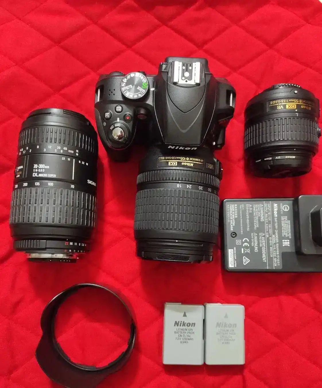 دوربین نیکونD3300همراه لنز فابریک،لنز سیگما 70, 300ولنز 18,105همراه یک عدد باتری اضافه،کارتن لوازم همگی تکمیل خیلی کم استفاده شده در حد نومیباشد