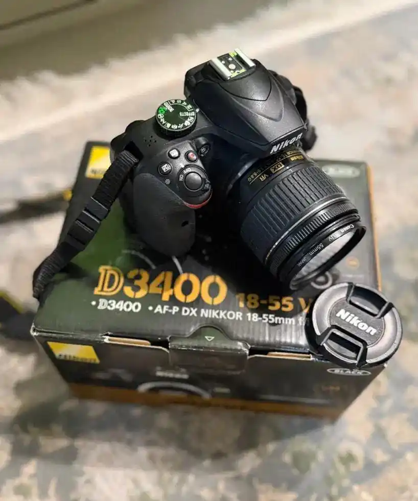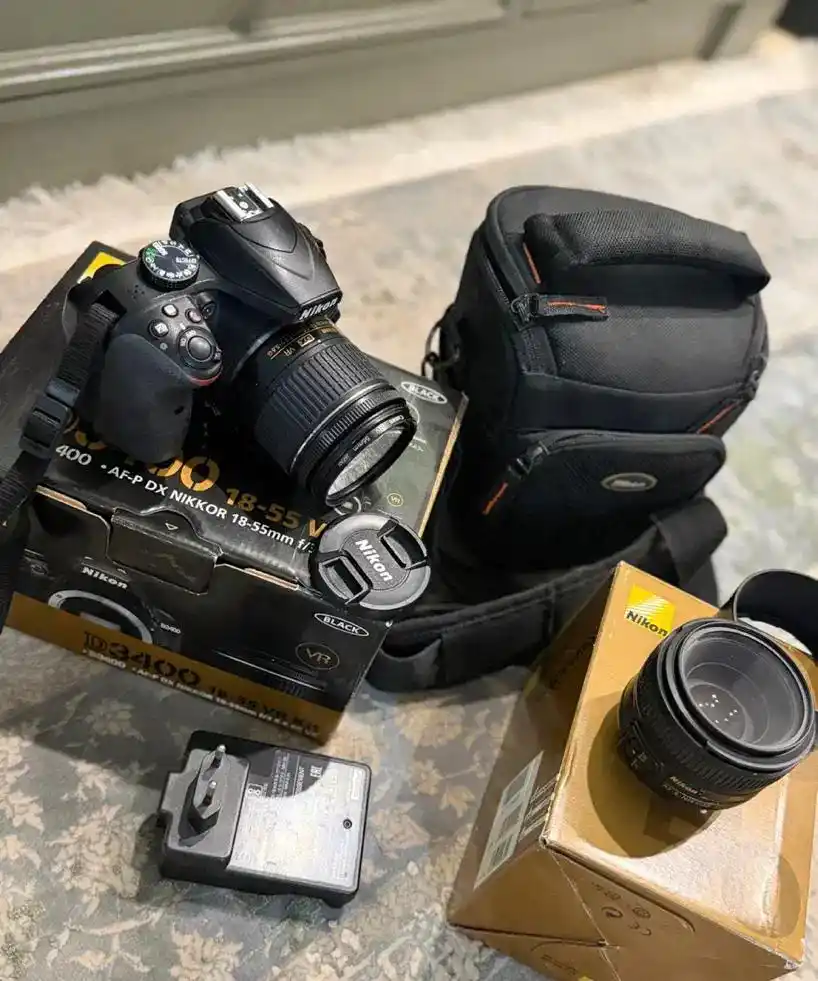 دوربین نیکون D3400 با لنز ۵۵-۱۸ به همراه لنز پرتره 50 نیکون f1.8 کاملا تمیز همراه با تمام وسایل جانبی باتری و شارژر اصلی ،کیف و محافظ لنز برای هر دو لنز مناسب برای شروع عکاسی اگر خریدار باشید تخفیف ام داره
