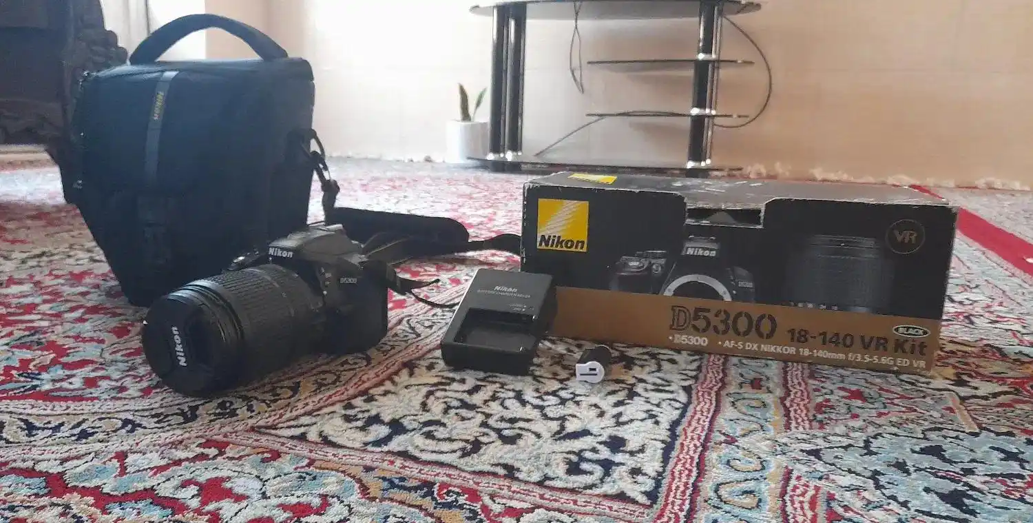 دوربین عکاسی حرفه ای نیکون ۵۳۰۰ دی با کل لوازم و تجهیزات کیف شارژر رم لیدر و جعبه ی خود دوربین در حد ۱۰ هزار تا شات