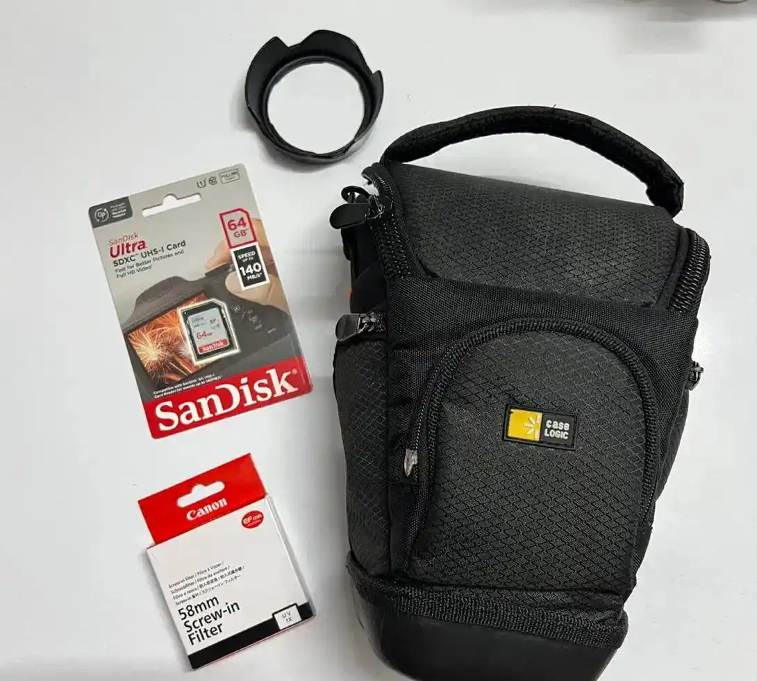 همراه دوربین یک گلس صفحهنمایش و فیلتر uv ، یک رم ۶۴ گیگ sanDisk ، یک کیف دوربین ، یک بند دوربین و یک هود لنز هم تقدیمتون میشه.