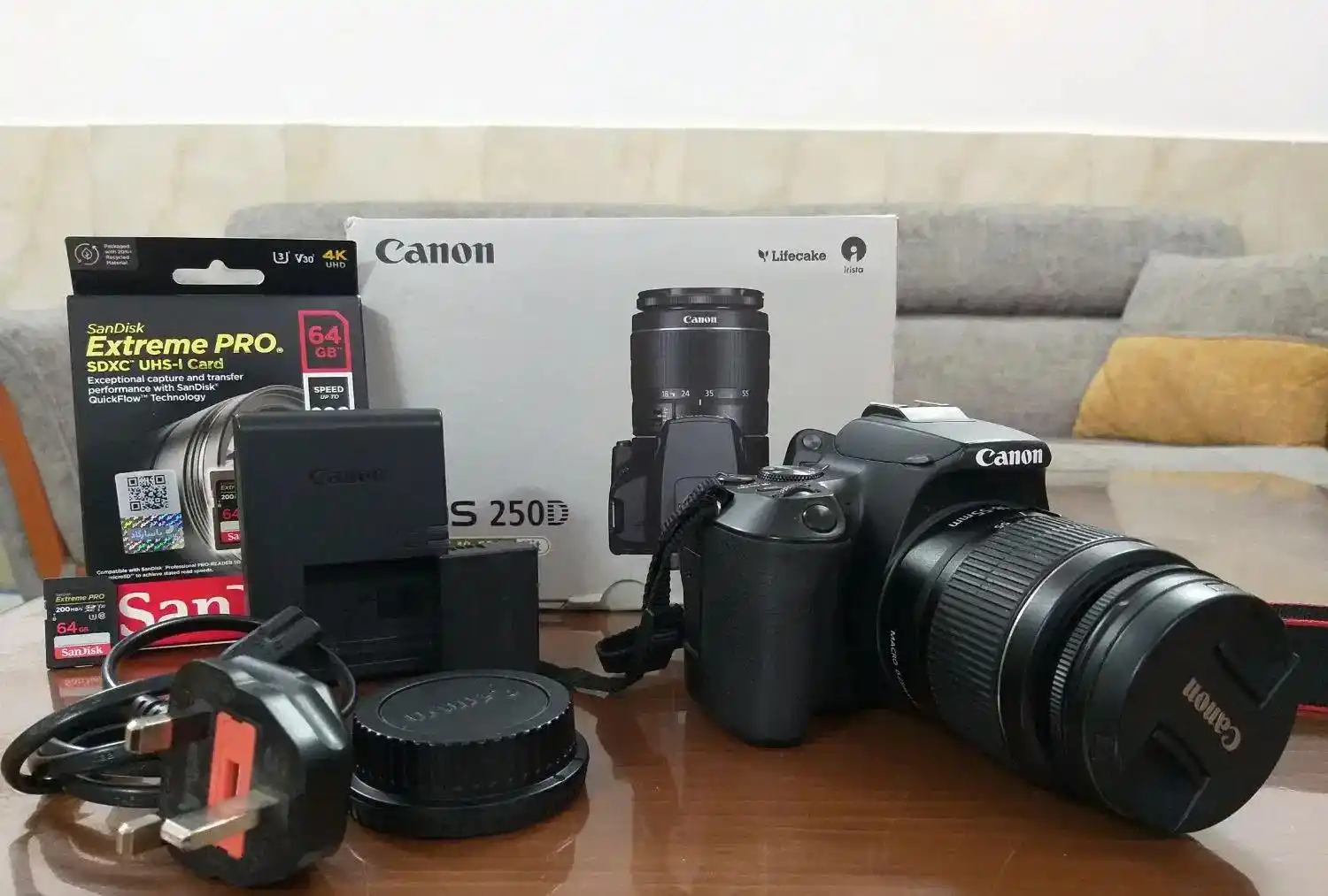 دوربین کنون 250d کاملا سالم و تمیز همراه کارتن و دفترچه ،بدون ضرب خوردگی همراه لنز۱۸_۵۵ فابیریک خودش