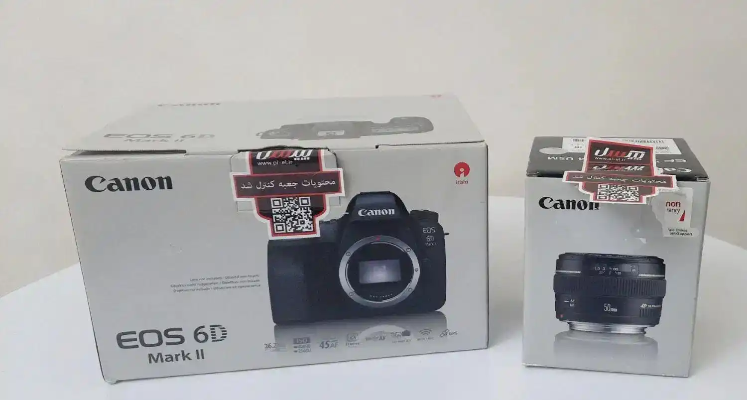 دوربین فول فریم کنون 6D mark II لنز ۵۰ فیکس کنون اف ۱.۴ در حد نو بدون خط و خش بدون پیکسل سوختگی بدون فیلم برداری به همراه باتری اصلی و شارژ و کابل و بند دوشی و جعبه