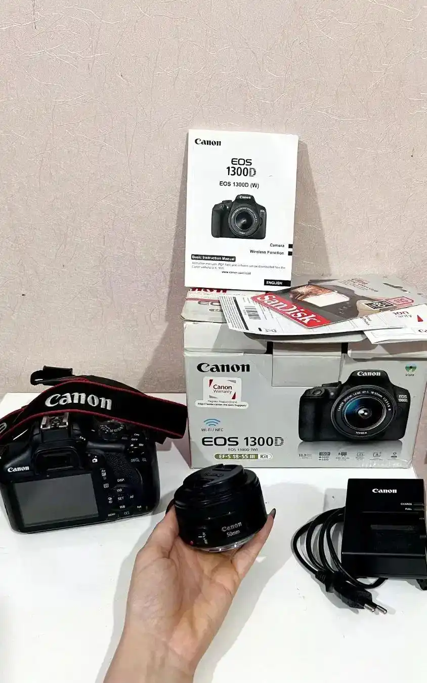 دوربین Canon 1300D بسیار تمیز، بدون تعمیر. بههمراه لنز 18-55 و لنز 50mm f/1.8. باکس، دفترچه، شارژر و لوازم کامل. لنزها سالم و بدون خطوخش. قیمت:25میلیون. اهواز – امکان تست حضوری.