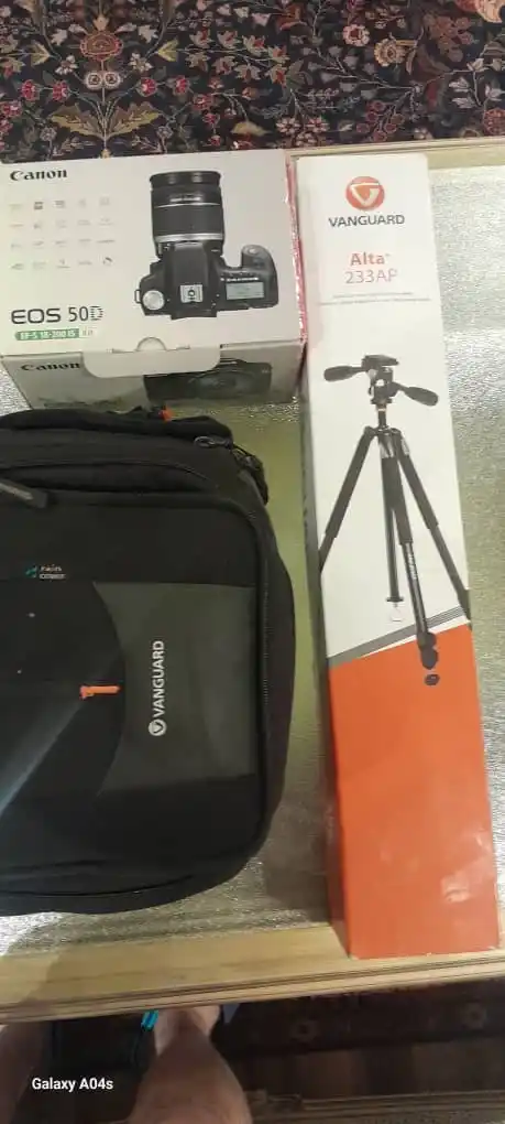 دوربین کانن اصل ژاپن مدل Eos 50D ( زیر ۳۰۰۰ شات در حد نو ) لنز اصل ژاپن حرفه ای مدل 18_200 کیف مخصوص دوربین و لب تا پ ضد ضربه و ضد آب مارک ونگارد سوئیس پایه دوربین حرفه ای ؛ چرخش ۳۶۰ درجه ؛ با تراز مارک ونگارد سوئیس