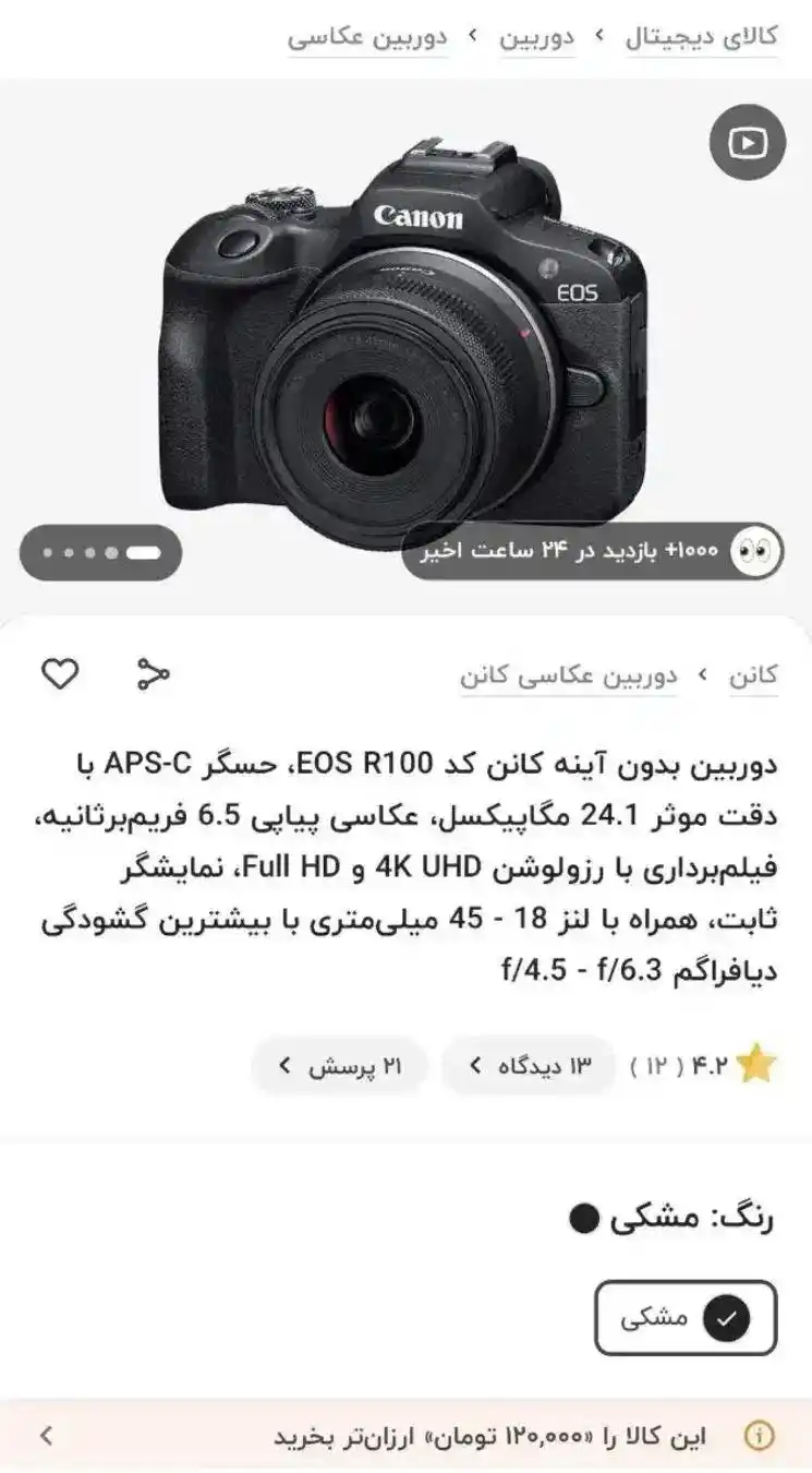 دوربین نو Canon R100(New2025)با کیت۴۵×۱۸وکیف
